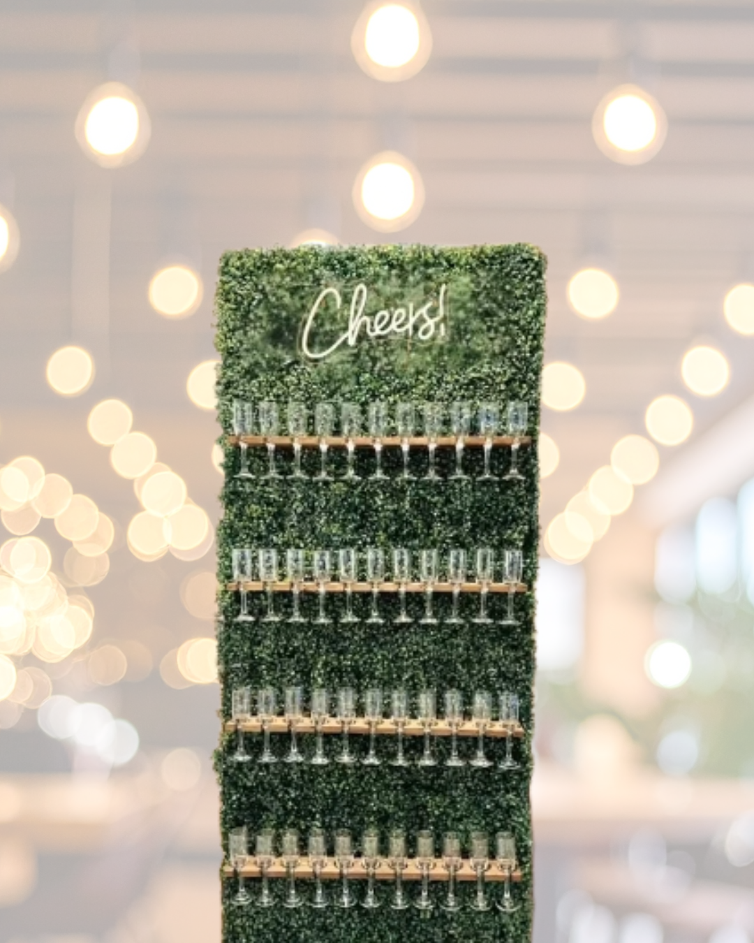 A greenery wall with 44 glass holders. We keep it poured during cocktail hour so guests can grab, sip, and socialize — no waiting, no mess.
